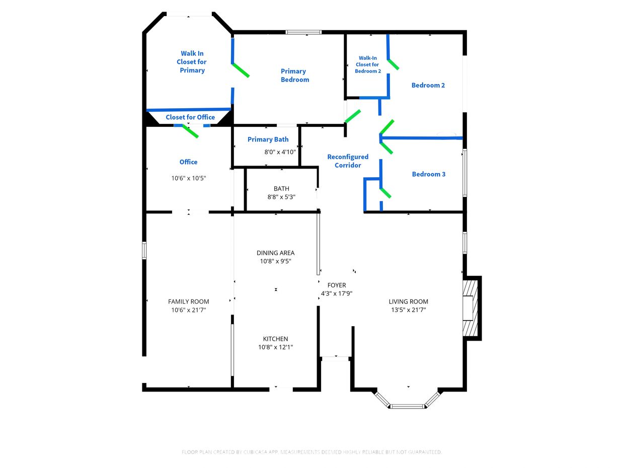 As you can see with very few minor wall adjustments (in blue and green), this home can be re-configured as a 3 bed plus office or Bonus Room. We included a closet so you can have this play as a 4 bedroom should you need it. When I spoke to my Contractor, he gave me a ball park figure of about $30,000 to do the wall demo and construction, texture and paint. My Sellers sadly do not have the time to do this themselves as they wanted to put the house on the market in November.
